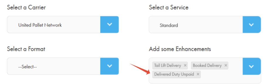 To override the International Commercial Terms per shipment, you can book a shipment with Delivered Duty Paid (DDP) or Delivered Duty Unpaid (DDU) enhancements. The option are available in shipment rules and manual shipments booking