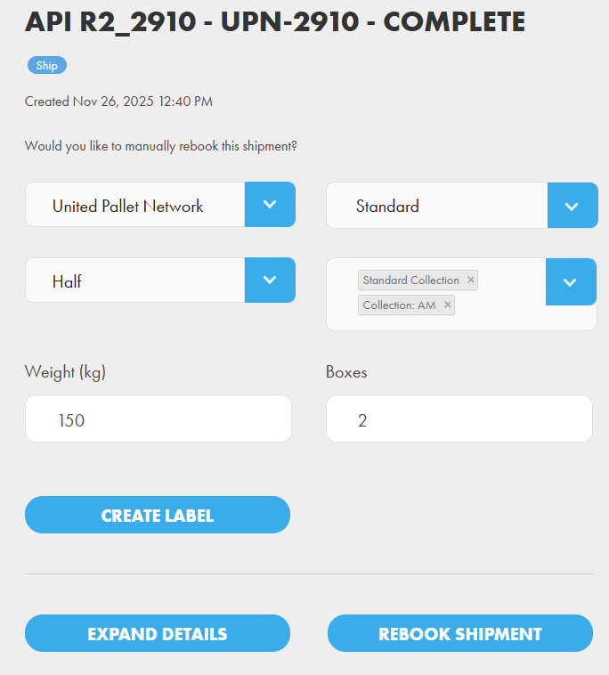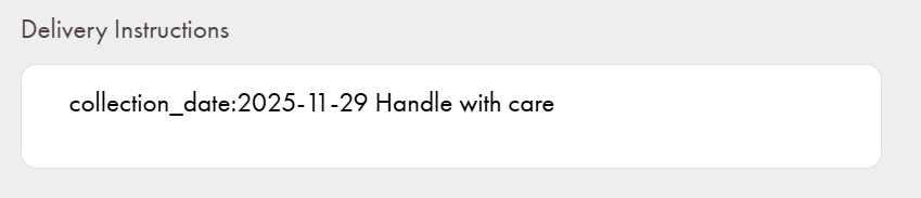 For the example below, collection date will be set as 2025-11-29 and the new shipment instructions will be updated to "Handle with care".